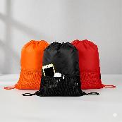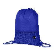 Mochila saco confeccionada em poliéster 420D com bolso externo em malha com entrada para fones de ouvido e alças ajustáveis em nylon.
